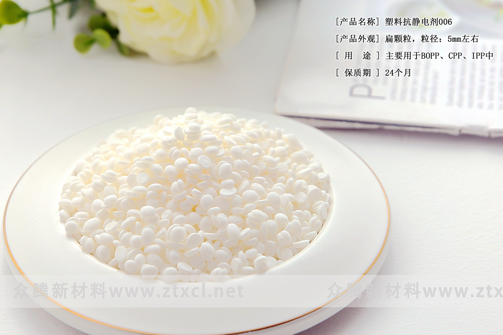 單硬脂酸甘油酯與硬脂基乙氧酰胺的復配物。006 是由脂肪酸酯及乙氧基酰胺復配而成,與傳統的脂肪酸酯與及脂肪胺復配相比,具有耐熱性更好,抗靜電劑性能更優異的特點。